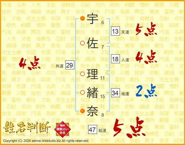 宇(6画)佐(7画) 理(11画)緒(15画)奈(8画)