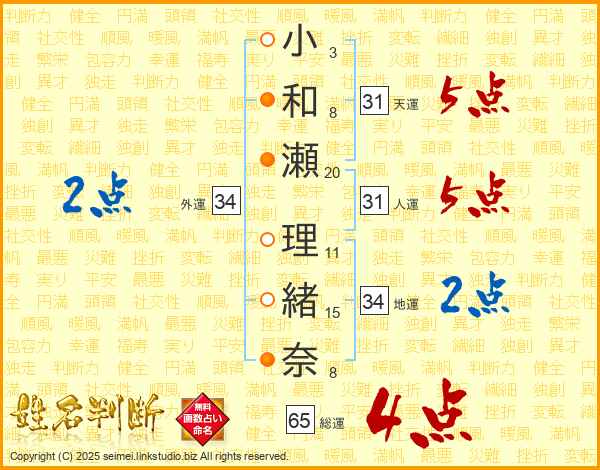 小(3画)和(8画)瀬(20画) 理(11画)緒(15画)奈(8画)