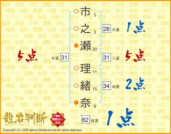 市(5画)之(3画)瀬(20画) 理(11画)緒(15画)奈(8画)
