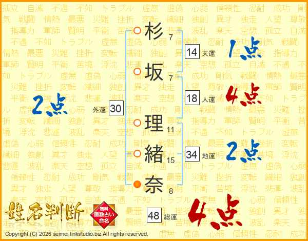 杉(7画)坂(7画) 理(11画)緒(15画)奈(8画)