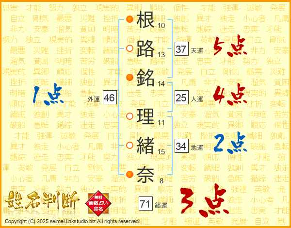 根(10画)路(13画)銘(14画) 理(11画)緒(15画)奈(8画)