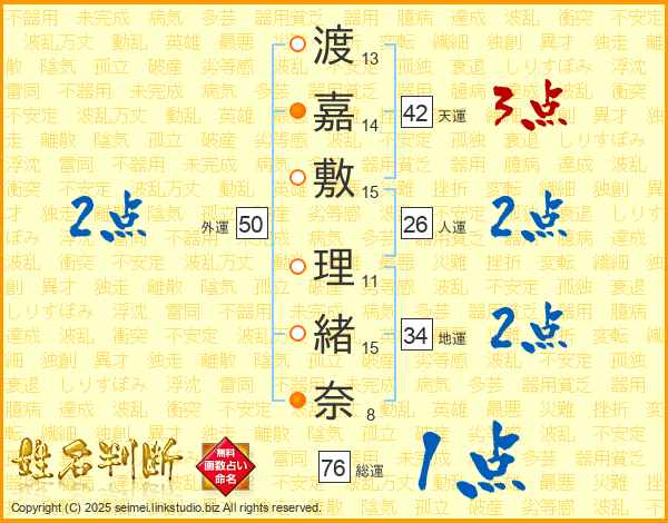 渡(13画)嘉(14画)敷(15画) 理(11画)緒(15画)奈(8画)