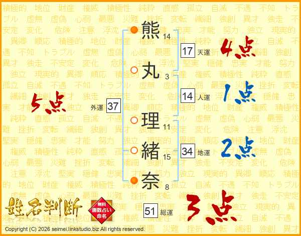 熊(14画)丸(3画) 理(11画)緒(15画)奈(8画)