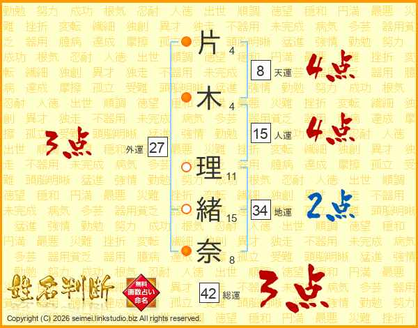 片(4画)木(4画) 理(11画)緒(15画)奈(8画)