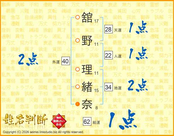 舘(17画)野(11画) 理(11画)緒(15画)奈(8画)