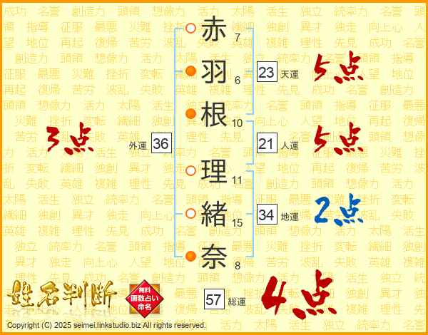 赤(7画)羽(6画)根(10画) 理(11画)緒(15画)奈(8画)