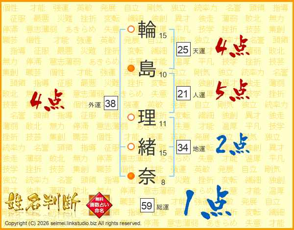 輪(15画)島(10画) 理(11画)緒(15画)奈(8画)
