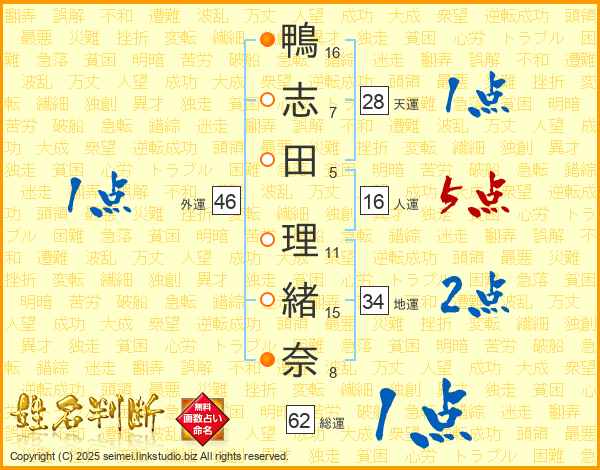 鴨(16画)志(7画)田(5画) 理(11画)緒(15画)奈(8画)
