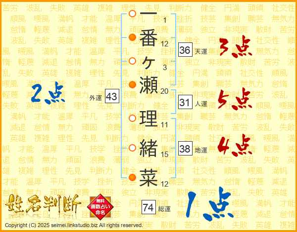 一番ヶ瀬理緒菜さんの外運は43画の2点!