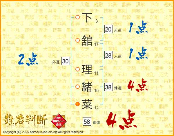 下(3画)舘(17画) 理(11画)緒(15画)菜(12画)