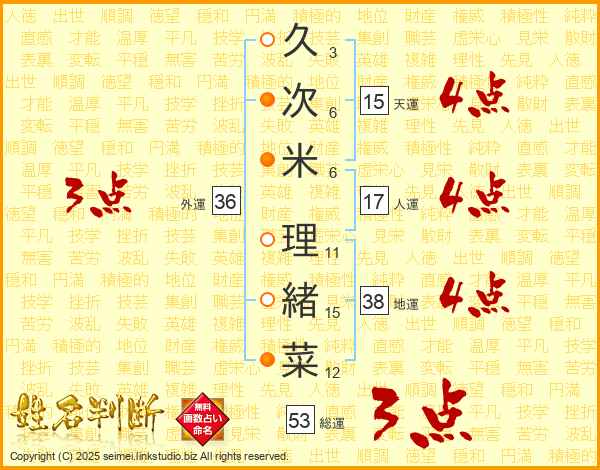 久(3画)次(6画)米(6画) 理(11画)緒(15画)菜(12画)