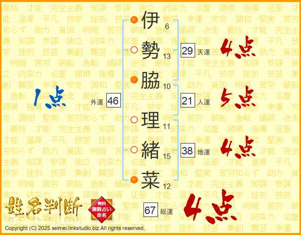 伊(6画)勢(13画)脇(10画) 理(11画)緒(15画)菜(12画)
