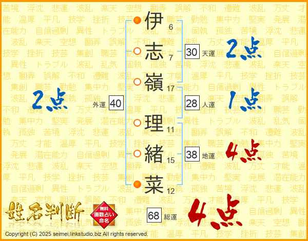 伊(6画)志(7画)嶺(17画) 理(11画)緒(15画)菜(12画)