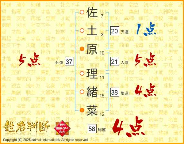 佐(7画)土(3画)原(10画) 理(11画)緒(15画)菜(12画)
