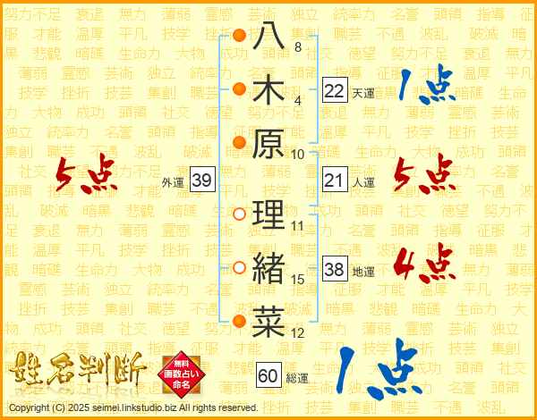 八(8画)木(4画)原(10画) 理(11画)緒(15画)菜(12画)