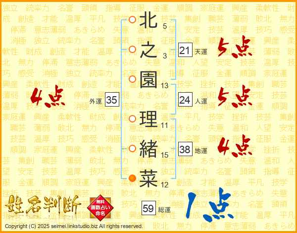 北(5画)之(3画)園(13画) 理(11画)緒(15画)菜(12画)
