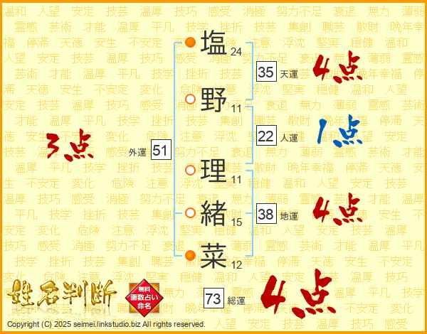 塩野理緒菜さんの総運は73画の4点!