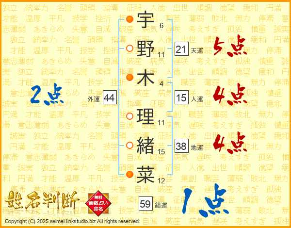 宇(6画)野(11画)木(4画) 理(11画)緒(15画)菜(12画)