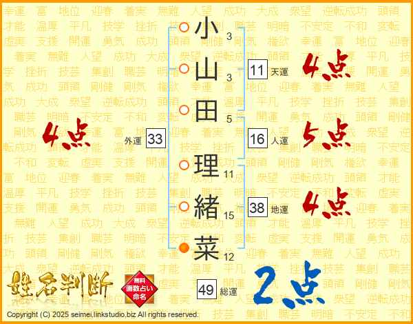 小(3画)山(3画)田(5画) 理(11画)緒(15画)菜(12画)