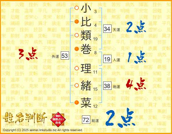 小(3画)比(4画)類(19画)巻(8画) 理(11画)緒(15画)菜(12画)