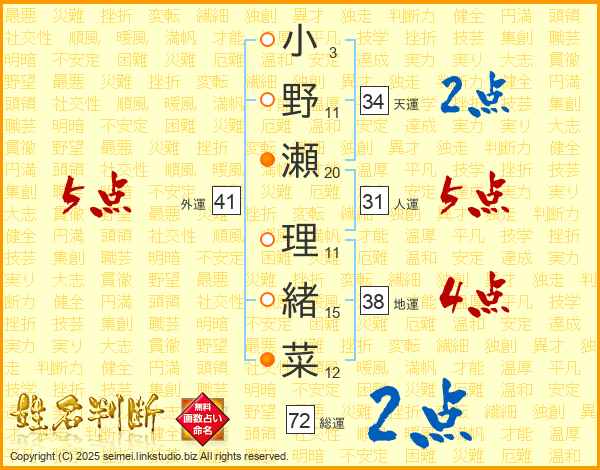 小(3画)野(11画)瀬(20画) 理(11画)緒(15画)菜(12画)