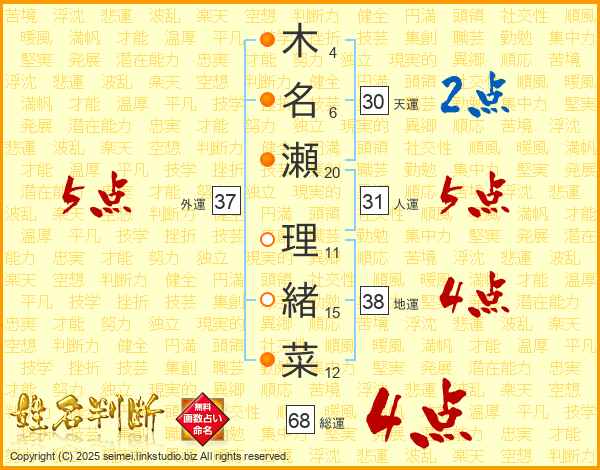 木(4画)名(6画)瀬(20画) 理(11画)緒(15画)菜(12画)