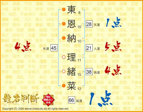東(8画)恩(10画)納(10画) 理(11画)緒(15画)菜(12画)