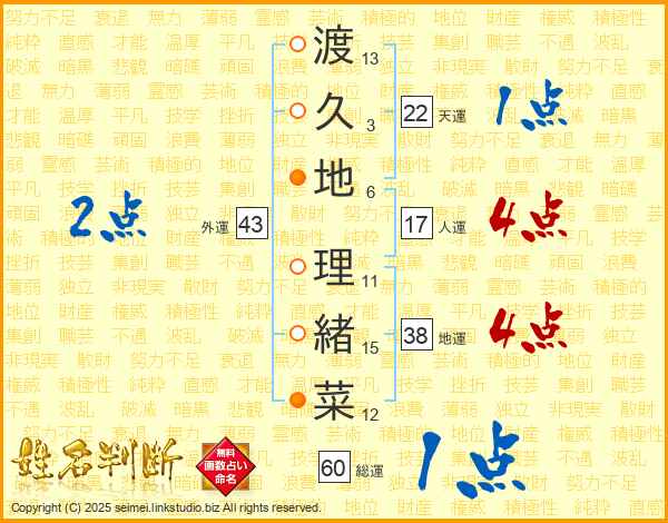 渡(13画)久(3画)地(6画) 理(11画)緒(15画)菜(12画)