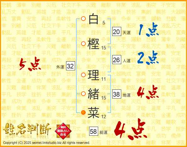 白(5画)樫(15画) 理(11画)緒(15画)菜(12画)