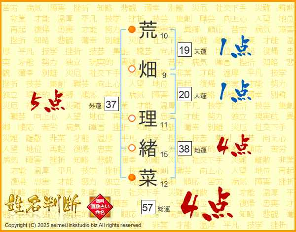 荒(10画)畑(9画) 理(11画)緒(15画)菜(12画)