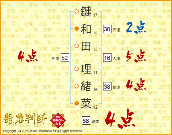 鍵(17画)和(8画)田(5画) 理(11画)緒(15画)菜(12画)