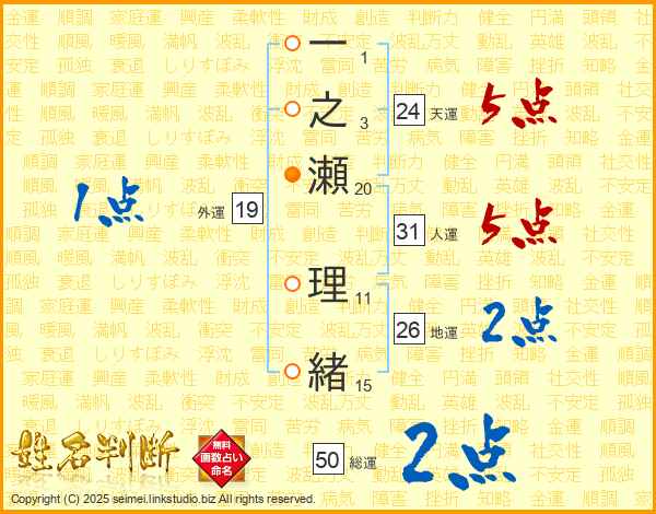 一(1画)之(3画)瀬(20画) 理(11画)緒(15画)