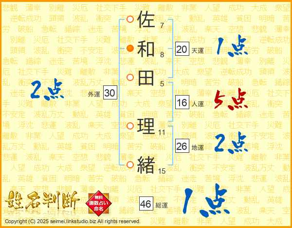 佐(7画)和(8画)田(5画) 理(11画)緒(15画)