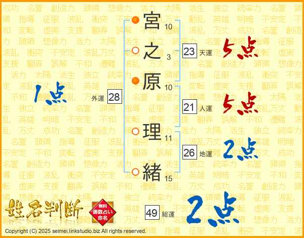 宮(10画)之(3画)原(10画) 理(11画)緒(15画)