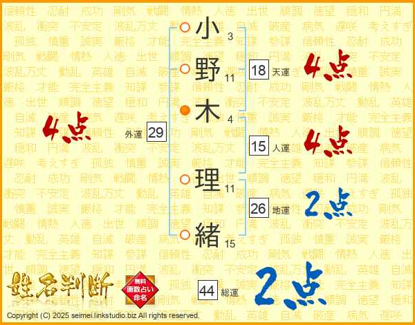 小(3画)野(11画)木(4画) 理(11画)緒(15画)