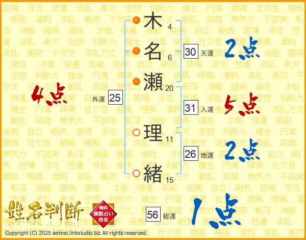 木(4画)名(6画)瀬(20画) 理(11画)緒(15画)