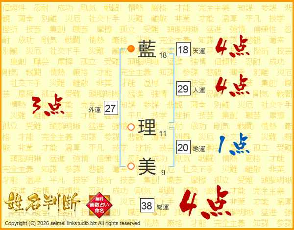 生活面を象徴する運勢です。外部から受ける影響力を表し、結婚運、家庭運や職場、環境への順応性を表します。総運から人運を引いた画数。姓や名が1文字の場合を除く。