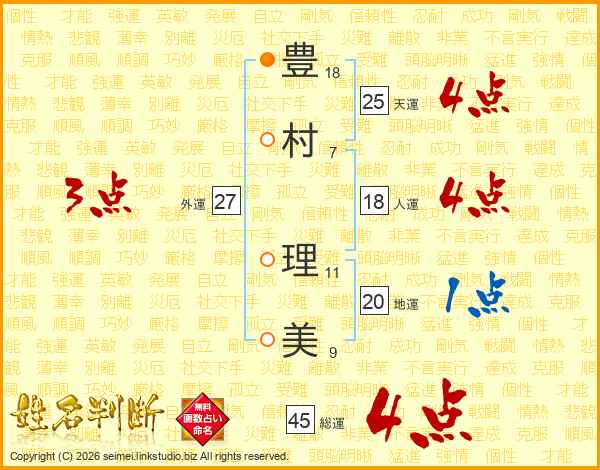 豊(18画)村(7画) 理(11画)美(9画)