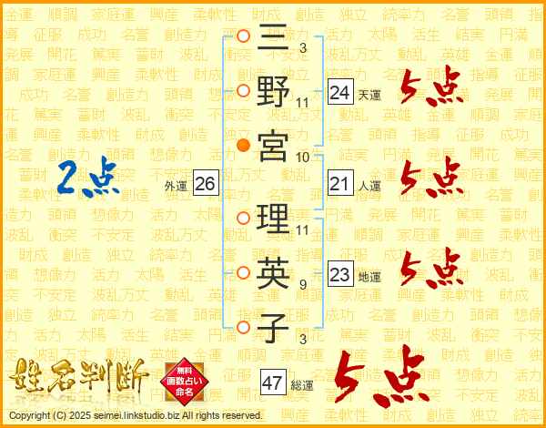 三野宮理英子さんの総運は47画の5点!