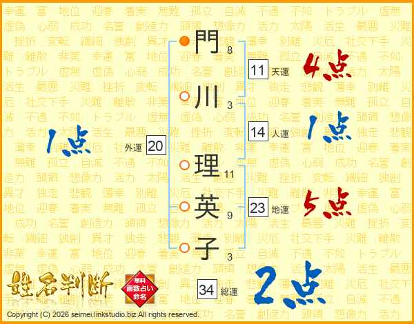 門(8画)川(3画) 理(11画)英(9画)子(3画)