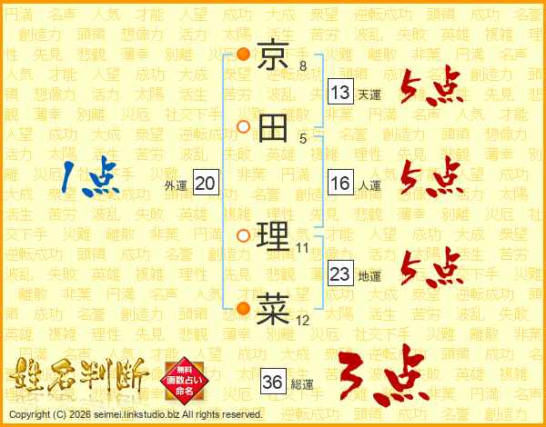 生活面を象徴する運勢です。外部から受ける影響力を表し、結婚運、家庭運や職場、環境への順応性を表します。総運から人運を引いた画数。姓や名が1文字の場合を除く。