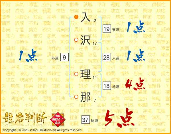 入(2画)沢(17画) 理(11画)那(7画)