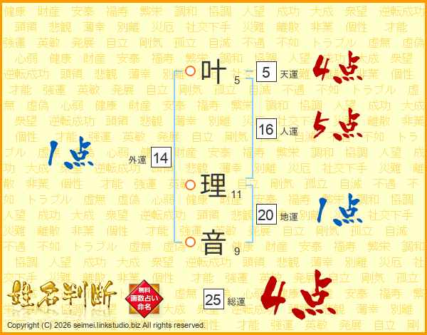生活面を象徴する運勢です。外部から受ける影響力を表し、結婚運、家庭運や職場、環境への順応性を表します。総運から人運を引いた画数。姓や名が1文字の場合を除く。