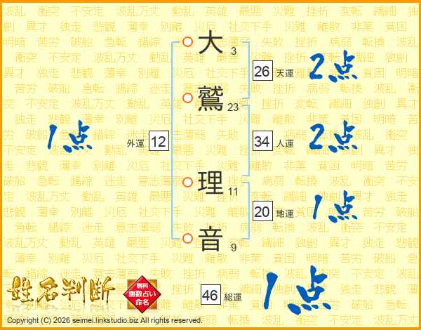 画数の奇数(○陽)と偶数(●陰)の配列で吉凶を占います。どちらかにかたよる名前は大凶名で避ける必要があります。画数の奇数偶数。