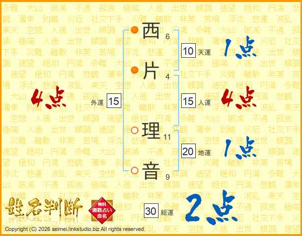 生活面を象徴する運勢です。外部から受ける影響力を表し、結婚運、家庭運や職場、環境への順応性を表します。総運から人運を引いた画数。姓や名が1文字の場合を除く。