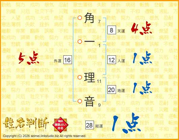 生活面を象徴する運勢です。外部から受ける影響力を表し、結婚運、家庭運や職場、環境への順応性を表します。総運から人運を引いた画数。姓や名が1文字の場合を除く。