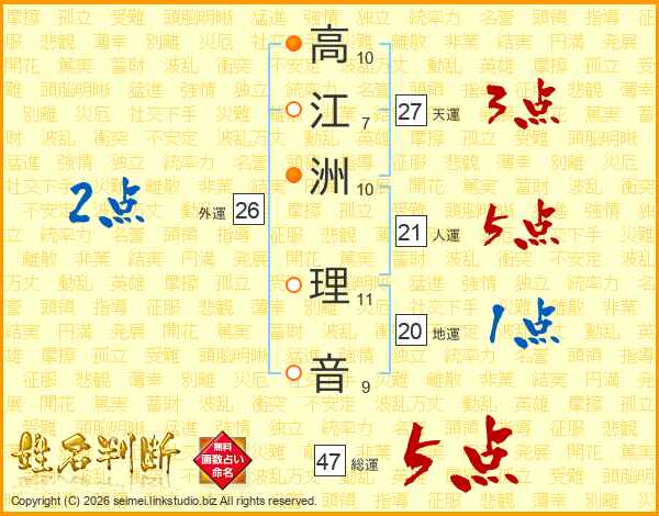 高(10画)江(7画)洲(10画) 理(11画)音(9画)