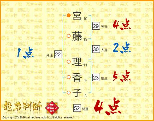 宮(10画)藤(19画) 理(11画)香(9画)子(3画)