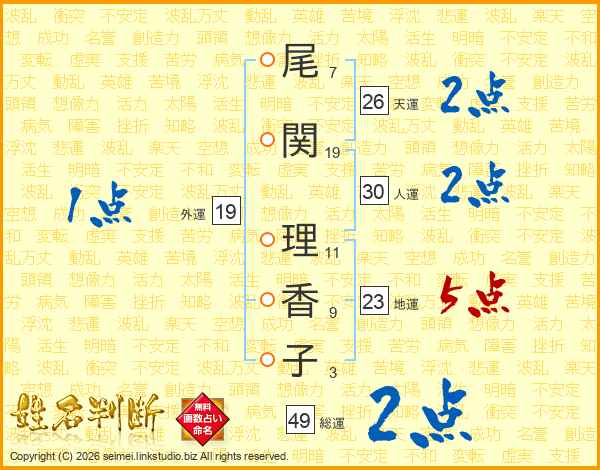 尾(7画)関(19画) 理(11画)香(9画)子(3画)