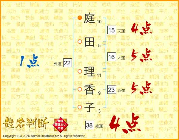 庭(10画)田(5画) 理(11画)香(9画)子(3画)